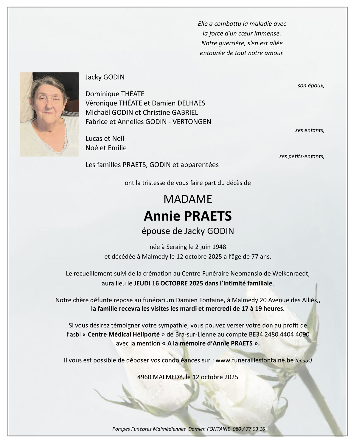 Décédée à Malmedy (4960, Belgique) le dimanche 12 octobre 2025 à l'âge de 77 ans