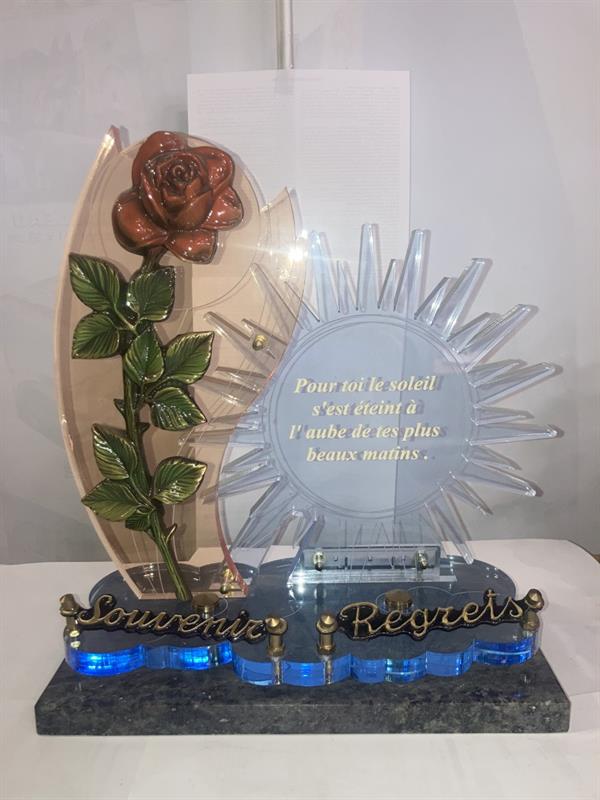La plaque est en altuglas, la rose est en bronze, le socle est en granit. PHOTO NON CONTRACTUELLE