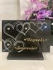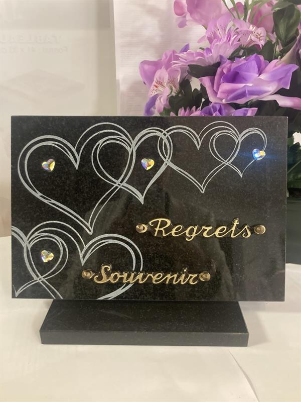 Plaque en granit noir fin avec gravure blanche de cœurs, les diamants sont en forme de cœurs également. PHOTO NON CONTRACTUELLE