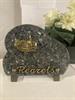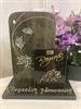 Plaque en granit noir fin et vert tropical avec gravure des feuilles en blanc et gravure à la feuille d'or "Regrets". PHOTO NON CONTRACTUELLE