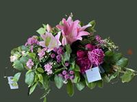 Petit montage composé de lys roses, mini chrysanthème et flox dans les tons de rose pastelle.
