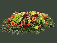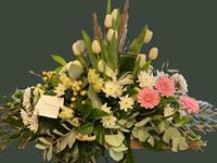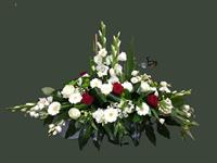 Montage floral de grande taille composé de roses, gerberas et glaïeuls.