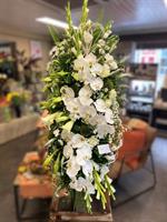 Mortuaire sur chevalet composé de fleurs blanches et d'orchidées.