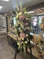 Montage mortuaire sur chevalet composé de fleurs roses et blanches et d'hortensia.