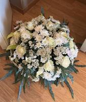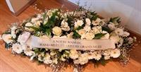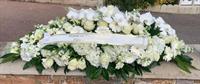 Photo non contractuelle | Dessus de cercueil blanc Dessus de cercueil blanc avec feuillage et fleurs de saison / Longueur 120 cm - Photo non contractuelle