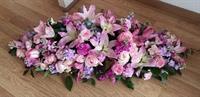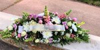 Photo non contractuelle | Dessus de cercueil pastel Dessus de cercueil pastel avec feuillage et fleurs de saison / Longueur 120 cm - Photo non contractuelle