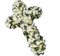 Photo non contractuelle | Croix blanche Croix blanche de fleurs de saison avec feuillage / Longueur 100 cm - Photo non contractuelle