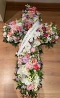 Photo non contractuelle | Croix Pastel Croix pastel de fleurs de saison avec feuillage / Longueur 100 cm - Photo non contractuelle