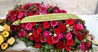 Photo non contractuelle | Dessus de cercueil rouge Dessus de cercueil rouge avec feuillage et fleurs de saison / Longueur 120 cm - Photo non contractuelle