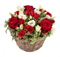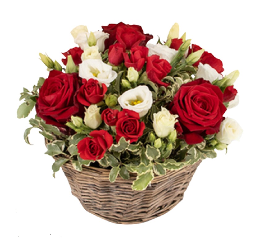 Photo non contractuelle | Corbeille rouge & blanche Corbeille ronde de fleurs de saison dans les tons de rouge et de blanc avec feuillage - Diamètre 30 cm