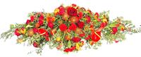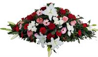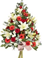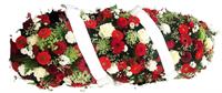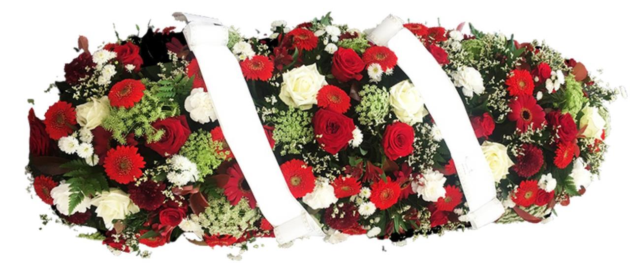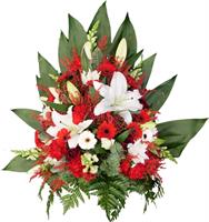 Photo non contractuelle | Gerbe piquée rouge & blanche Généreuse gerbe piquée rouge et blanche à base de fleurs de saison sur luxuriant feuillage - Env. 90 cm