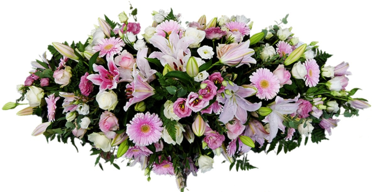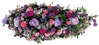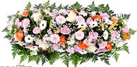 Photo non contractuelle | Desssus de cercueil pastel Dessus de cercueil couvrant avec fleurs de saison pastel - Env. 160 cm - Ruban inclus avec 50 caractères max -