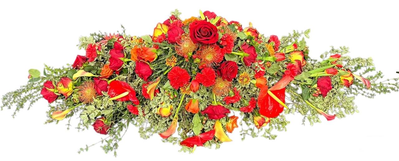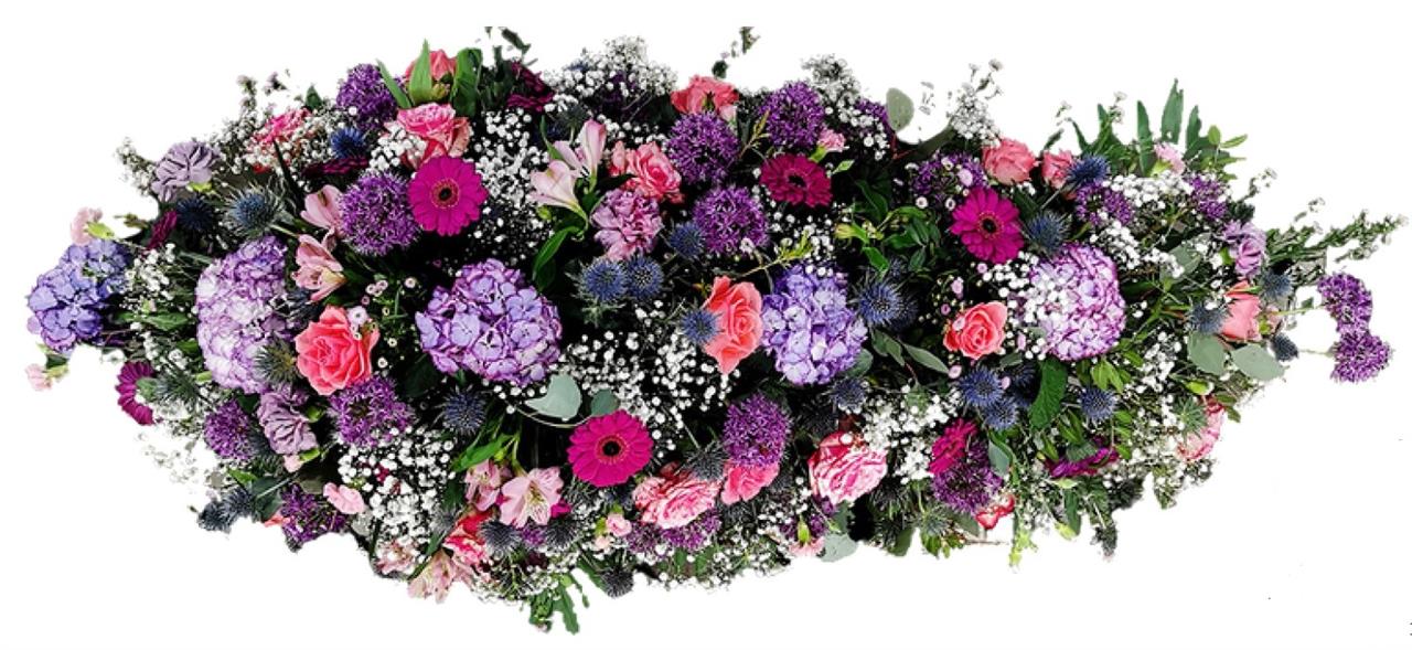 Photo non contractuelle | Desssus de cercueil coloré Dessus de cercueil couvrant avec fleurs de saison colorées - Env. 160 cm - Ruban inclus avec 50 caractères max -