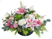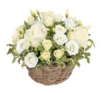 Photo non contractuelle | Corbeille blanche Corbeille ronde de fleurs de saison dans les tons de blanc et vert - Diamètre 30 cm