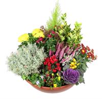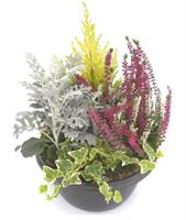Photo non contractuelle | Composition fleurie / Petit modèle Composition avec plantes et fleurs de saison, à base de 4 à 5 plantes vertes et fleuries - Diamètre env. 40 cm - Convient pour les cimetières