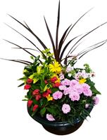 Photo non contractuelle | Composition fleurie / Grand modèle Généreuse composition fleurie avec plantes et fleurs de saison, , à base de 8 à 9 plantes vertes et fleuries - Diamètre env. 50 cm - Convient pour les cimetières max -
