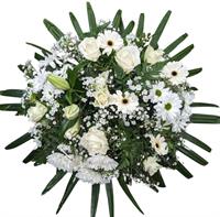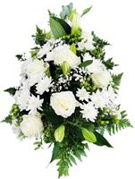 Photo non contractuelle | Gerbe piquée blanche Gerbe piquée blanche à base de fleurs de saison sur luxuriant feuillage - Env. 40 cm