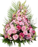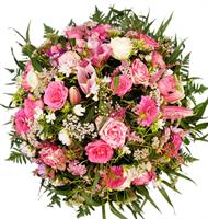 Photo non contractuelle | Gerbe piquée pastel Gerbe piquée pastel à base de fleurs saison dans les tons de rose sur luxuriant feuillage - Env. 80 cm