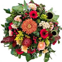 Photo non contractuelle | Gerbe à main colorée Gerbe à main colorée à base de fleurs saison dans les tons de rouge et orange sur lit de feuillage - Env. 60 cm