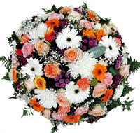 Photo non contractuelle | Coussin coloré Eclatant coussin rond de fleurs de saison colorées agrémentées d'un délicat feuillage - Env. 70 cm - Ruban inclus avec 50 caractères max -