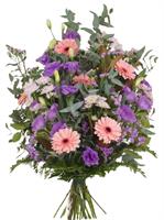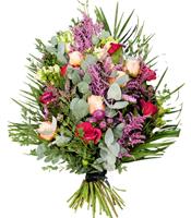 Photo non contractuelle | Gerbe à main pastel Gerbe à main pastel à base de fleurs saison dans les tons de rose et parme sur lit de feuillage - Env. 40 / 50 cm