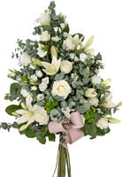 Photo non contractuelle | Gerbe piquée blanche Généreuse gerbe piquée blanche à base de fleurs de saison sur luxuriant feuillage - Env. 90 cm