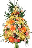 Photo non contractuelle | Gerbe piquée colorée Eclatante gerbe colorée à base de fleurs saison colorée sur lit de feuillage - Env. 70 cm