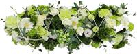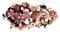 Photo non contractuelle | Desssus de cercueil pastel Délicat dessus de cercueil avec fleurs de saison pastel - Env. 150 cm - Ruban inclus avec 50 caractères max -