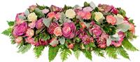 Photo non contractuelle | Desssus de cercueil pastel Délicat dessus de cercueil avec fleurs de saison pastel - Env. 120 cm - Ruban inclus avec 50 caractères max -