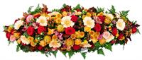 Photo non contractuelle | Desssus de cercueil coloré Eclatant dessus de cercueil avec fleurs de saison colorées - Env. 120 cm - Ruban inclus avec 50 caractères max -