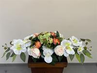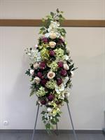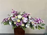 niet-contractuele foto | Composition funéraire en soie – Orchidées & roses délicates Imposante et élégante composition réalisée en fleurs artificielles haut de gamme, conçue pour rendre un hommage solennel et raffiné.