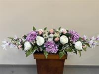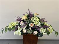 niet-contractuele foto | Montage floral en soie – Roses, orchidées & lavande Élégant arrangement en fleurs en soie de haute qualité, mêlant la douceur des roses, l’éclat des orchidées, et la fraîcheur de la lavande. Quelques callas et hortensias complètent harmonieusement cette composition, sublimée par un feuillage naturel.