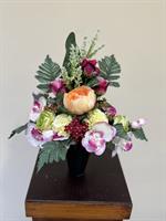 niet-contractuele foto | Montage floral en soie – Roses & orchidées Composition élégante et expressive en fleurs artificielles haut de gamme, associant de profondes roses, symboles d’amour et de respect, à de délicates orchidées et des fleurs. Le tout est harmonieusement complété par un feuillage vert structuré pour un rendu naturel et équilibré.