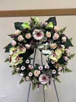 niet-contractuele foto | Couronne funéraire en soie – Roses, orchidées & gerberas Élégante couronne réalisée en fleurs artificielles haut de gamme, symbole d’hommage et de souvenir éternel.