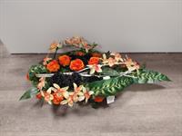 Composition florale artificielle Lys Gerberas Roses et Orchidées, idéal pour le devant de tombe. Dimension H50x60 Très bonne qualité Possibilité de mettre un ruban avec une inscription.