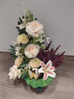 Composition florale de couleur pastel avec des roses, du Lys et de la bruyère en tissu. Dimension 40 cm de hauteur. Fabrication Française