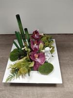 Composition florale sur plateau carré de dimension 24x24 cm. Orchidées et bambou avec un petit ange. Fabrication Française.