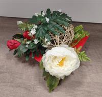 Composition florale artificielle se composant d'Orchidée et Pivoines de couleur rouge et blanc. Idéal pour le devant de tombe. Dimension H80X85 Très bonne qualité. Possibilité d'un ruban avec inscription