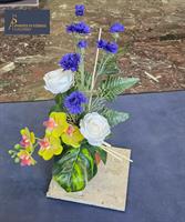 composition fleurs artificielle sur socle pierre