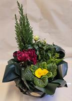 Photo non contractuelle | COMPOSTION FLORALE URANUS Composition de plantes vertes et fleuries, l'assemblage varie en fonction des saisons et de la disponibilité en magasin.