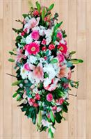 Photo non contractuelle | GERBE ALIZEE DESSUS DE CERCUEIL Assemblage de fleurs naturelles coupées variées selon la saison et la disponibilité en magasin. (différents choix de couleurs)