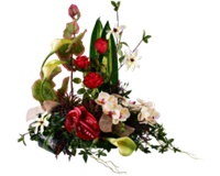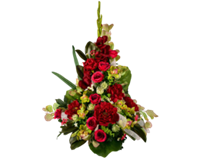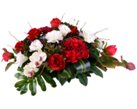 | Devant de tombe rouge Devant de tombe avec roses, orchidées, statices et pivoines dans support lesté - Tonalité rouge - Dimensions L 83 x l 42 x H 83 cm - Possibilité de rajouter option ruban (texte à préciser lors de la commande) -