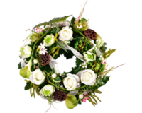 | Couronne crème Couronne de roses, magnolias, gerberas, lavandes, tillandsies et gypsophile sur support lesté - Diamètre env. 50 cm - Tonalité crème - Possibilité de rajouter option ruban (texte à préciser lors de la commande) -