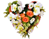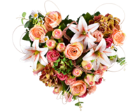 | Cœur saumon Cœur de roses et boutons, lys, hortensias, gardénias et echeverias dans support lesté - Tonalité Saumon - Dimensions : 43 x 43 cm - - Possibilité de rajouter option ruban (texte à préciser lors de la commande) -