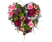 | Cœur rose Cœur de roses, protéas, callas, dahlias, chardons, succulents et ruban jute dans support lesté - Tonalité rose - Dimensions : 43 x 44 cm - - Possibilité de rajouter option ruban (texte à préciser lors de la commande) -