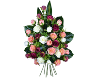 | Gerbe rose, crème et fuchsia Gerbe avec roses et boutons, asparagus et bambous sur base lestée - Tonalité rose, crème et beauty - Dimensions 98 x 67 cm - Possibilité de rajouter option ruban (texte à préciser lors de la commande) -