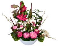 | Composition ultra-plate rose Composition ultra-plate avec roses, magnolias, gerberas, delphiniums, succulents et ruban de taffetas dans support lesté - Tonalité rose - Dimensions 39 x 17 et H 42 cm -