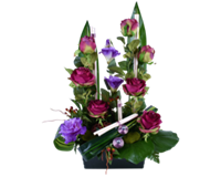 | Composition ultra-plate parme Composition ultra-plate avec roses, magnolias, gerberas, delphiniums, succulents et ruban de taffetas dans support lesté - Tonalité parme - Dimensions 39 x 17 et H 42 cm -