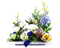 | Composition ultra-plate crème Composition ultra-plate avec roses, magnolias, gerberas, delphiniums, succulents et ruban de taffetas dans support lesté - Tonalité crème - Dimensions 39 x 17 et H 42 cm -