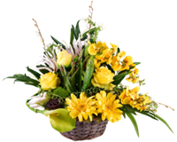 | Panier jaune Panier avec roses, glycines, callas, gerberas, succulents dans support lesté - Tonalité jaune - Dimensions 49 x 27 et H 48 cm -